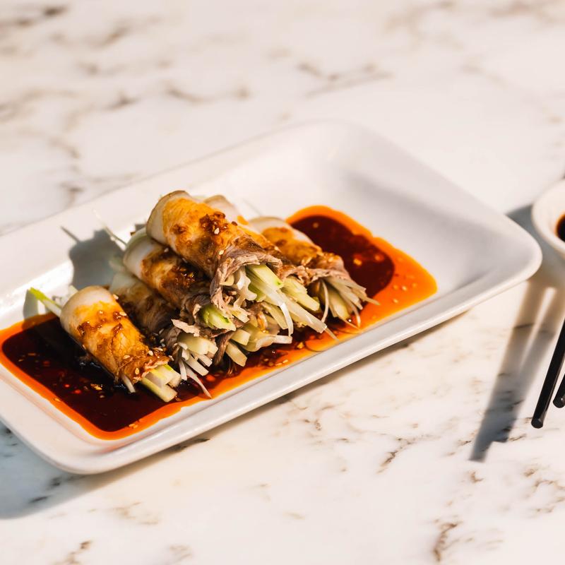 Tuna, salmon, white fish, avocado, mango, lettuce, topped with jalapeno tobiko ponzo sauce, wrapped with rice paper.